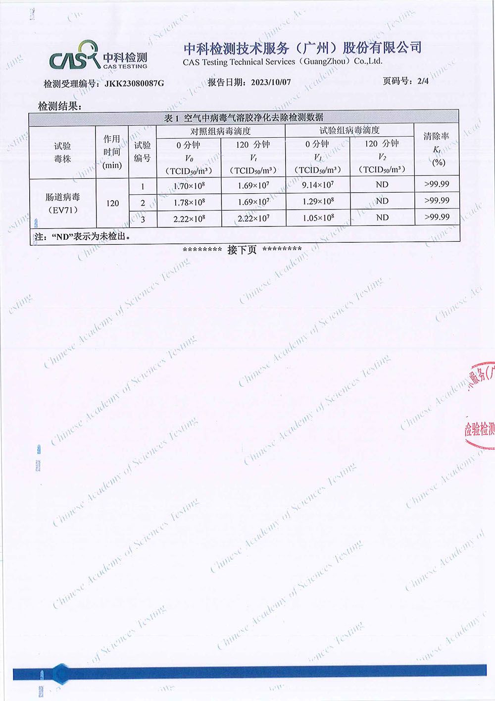 JKK23080087G 湖南上派新材料有限公司 除病毒(EV71)-CNAS