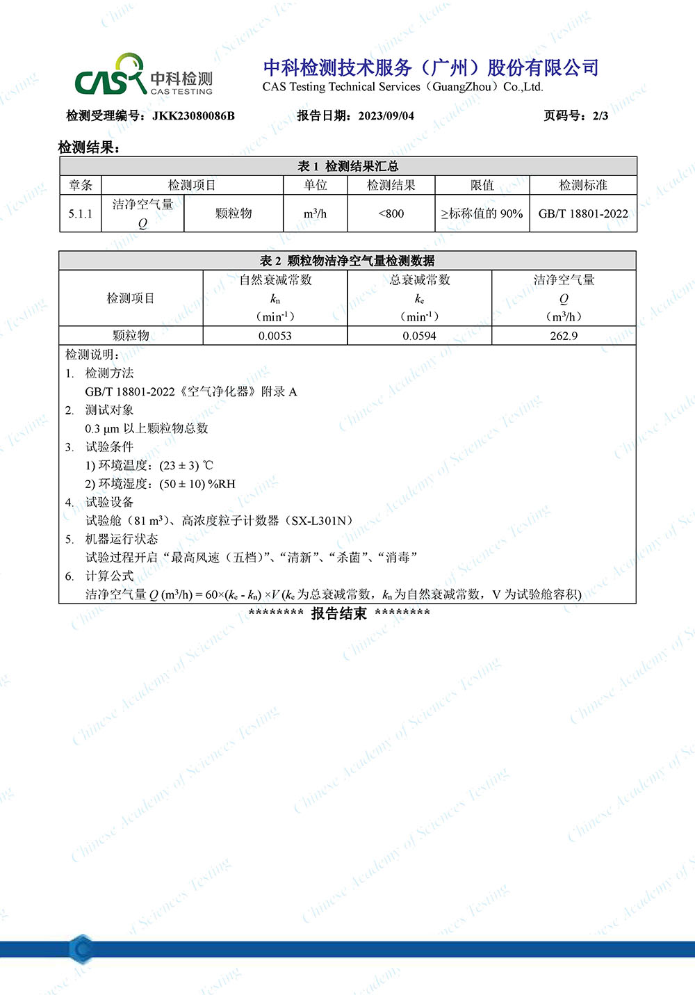 JKK23080086B 湖南上派科技有限公司  CADR(颗粒物)-不盖章 18801-2022-W