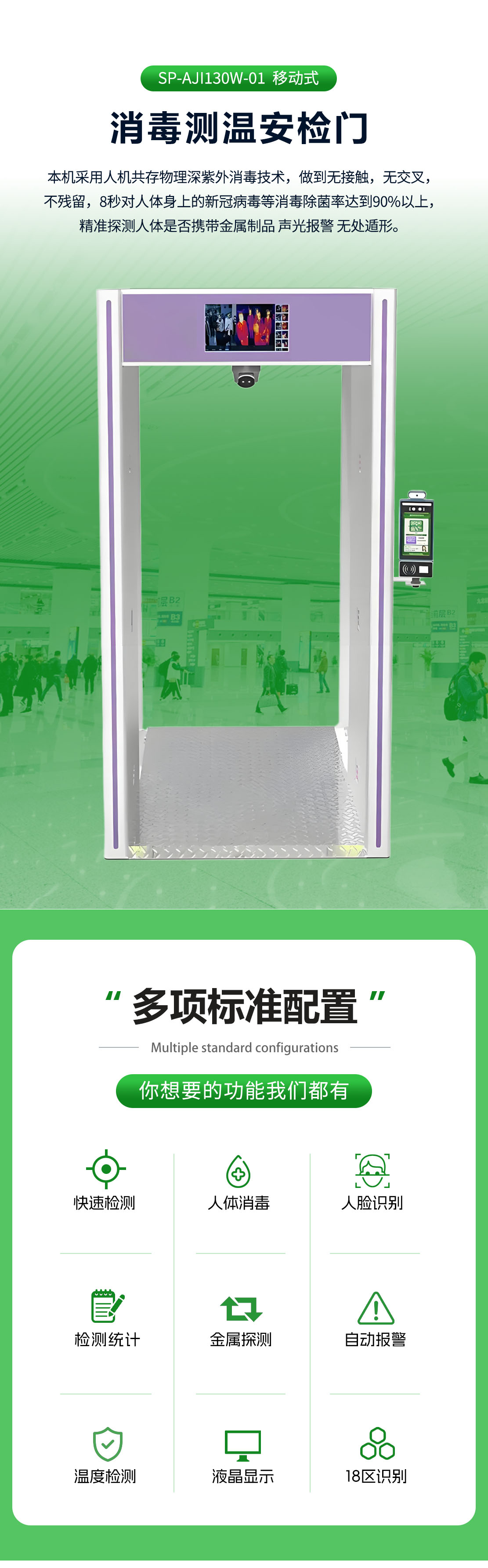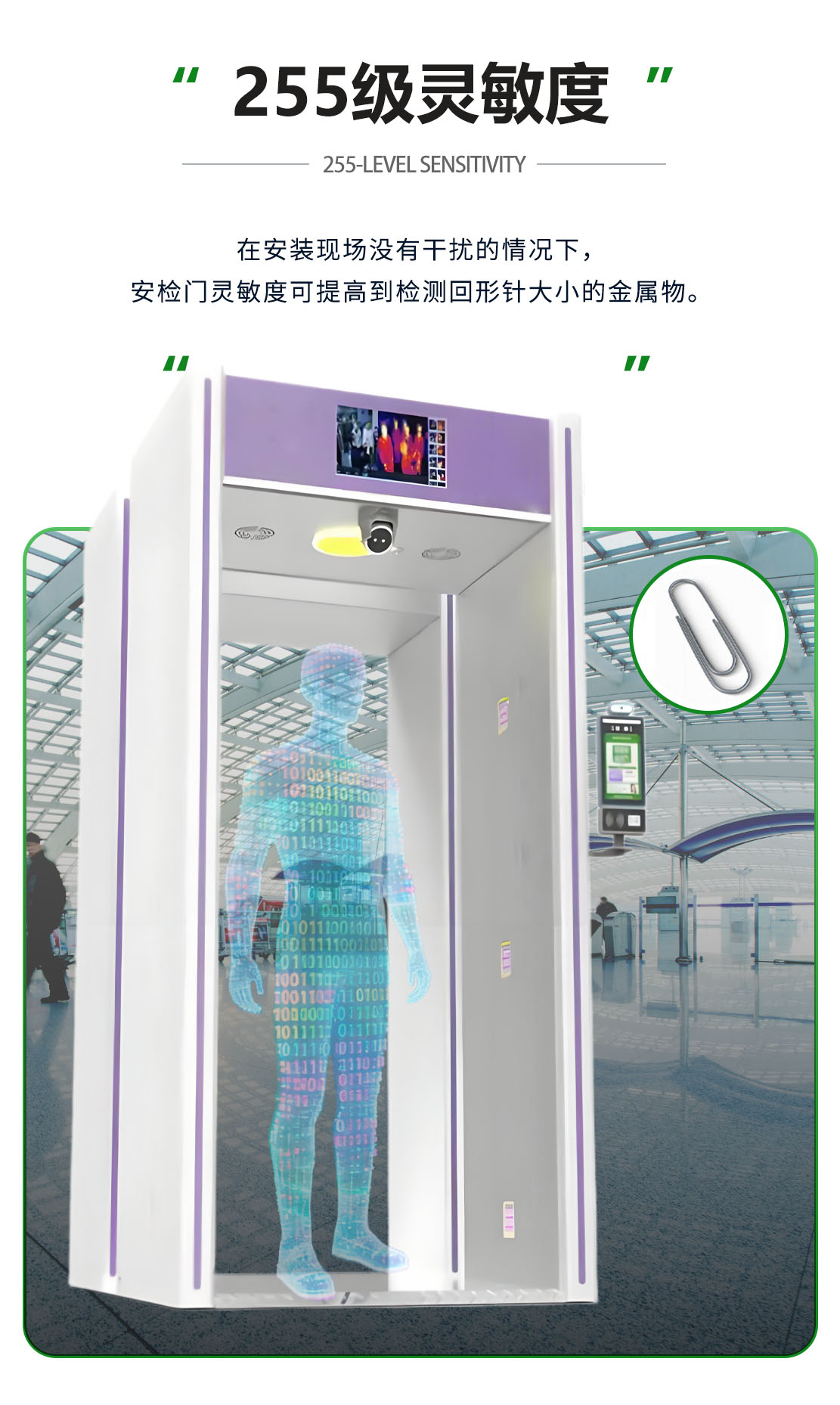 4.金属探测:可探测回形针大小金属物体,有效对违规物品核验,多区位报警功能,人体不同位置多个金属体过安检门会自动报警,并同步定位金属位置。