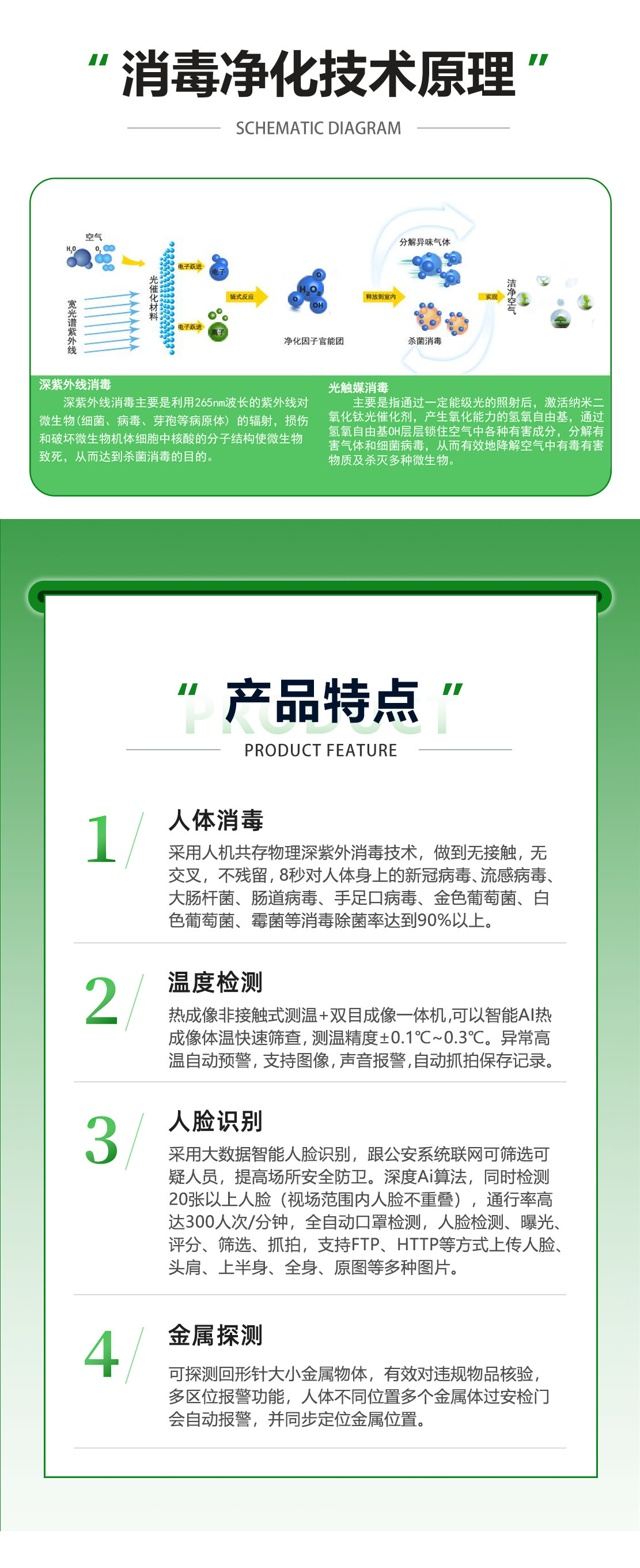1.人体消毒:采用人机共存物理深紫外消毒技术,做到无接触,无交叉,不残留,8秒对人体身上的新冠病毒、流感病毒、大肠杆菌、肠道病毒、手足口病毒、金 色葡萄菌、白色葡萄菌、霉菌等消毒除菌率达到90%以上。